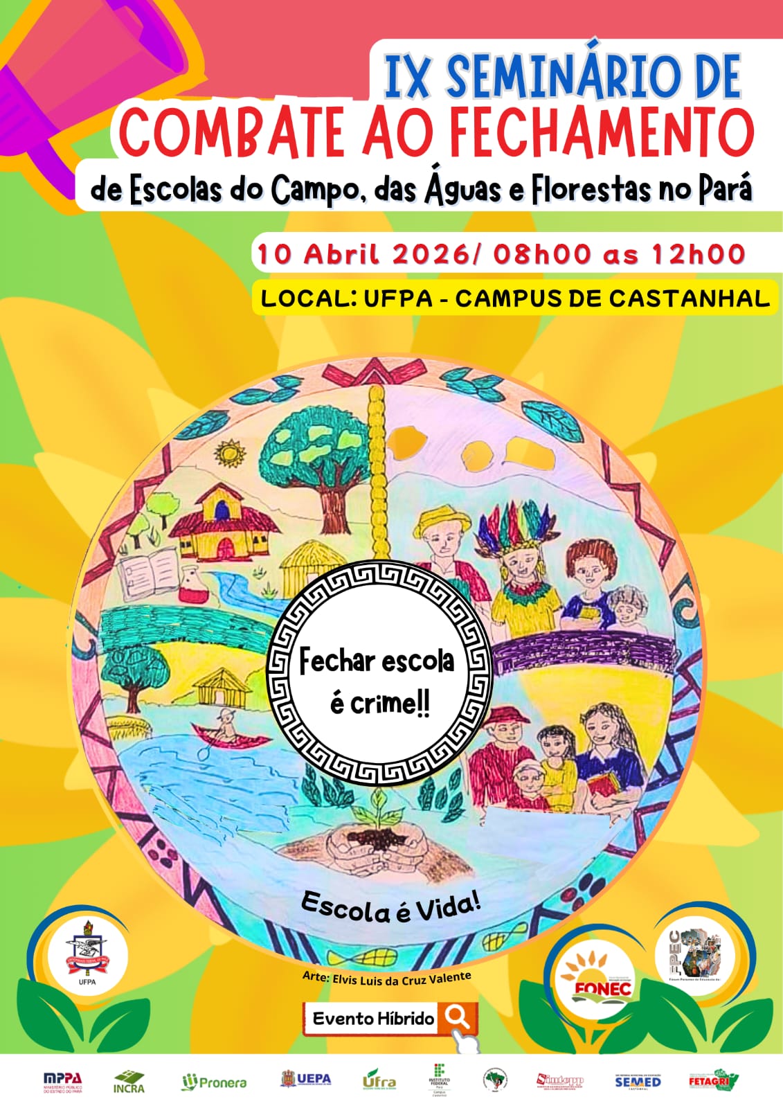 O Fórum Paraense e os Fóruns Regionais e Municipais de Educação do Campo, em aliança com os movimentos e organizações sociais e sindicais do campo, das águas e das florestas, juntamente com diversos outros parceiros institucionais, realizarão o IX Seminário de Combate ao Fechamento de Escolas do Campo, Indígenas e Quilombolas no Estado do Pará. O evento ocorrerá no dia 10 de abril de 2026, das 8h30 às 12h30, no Ginásio de Esportes da UFPA, Campus de Castanhal.
