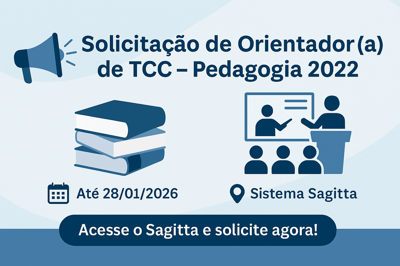 A Faculdade de Educação (FACED) informa aos(as) discentes da turma de Licenciatura em Pedagogia 2022 que está aberto o período para solicitação de orientador(a) de Trabalho de Conclusão de Curso (TCC).